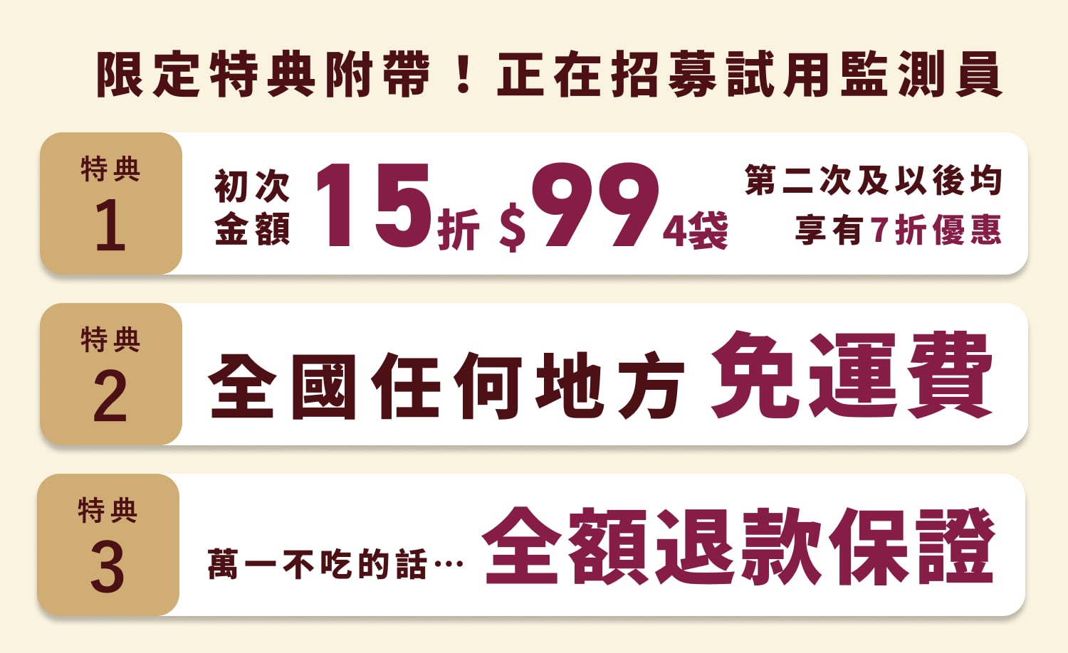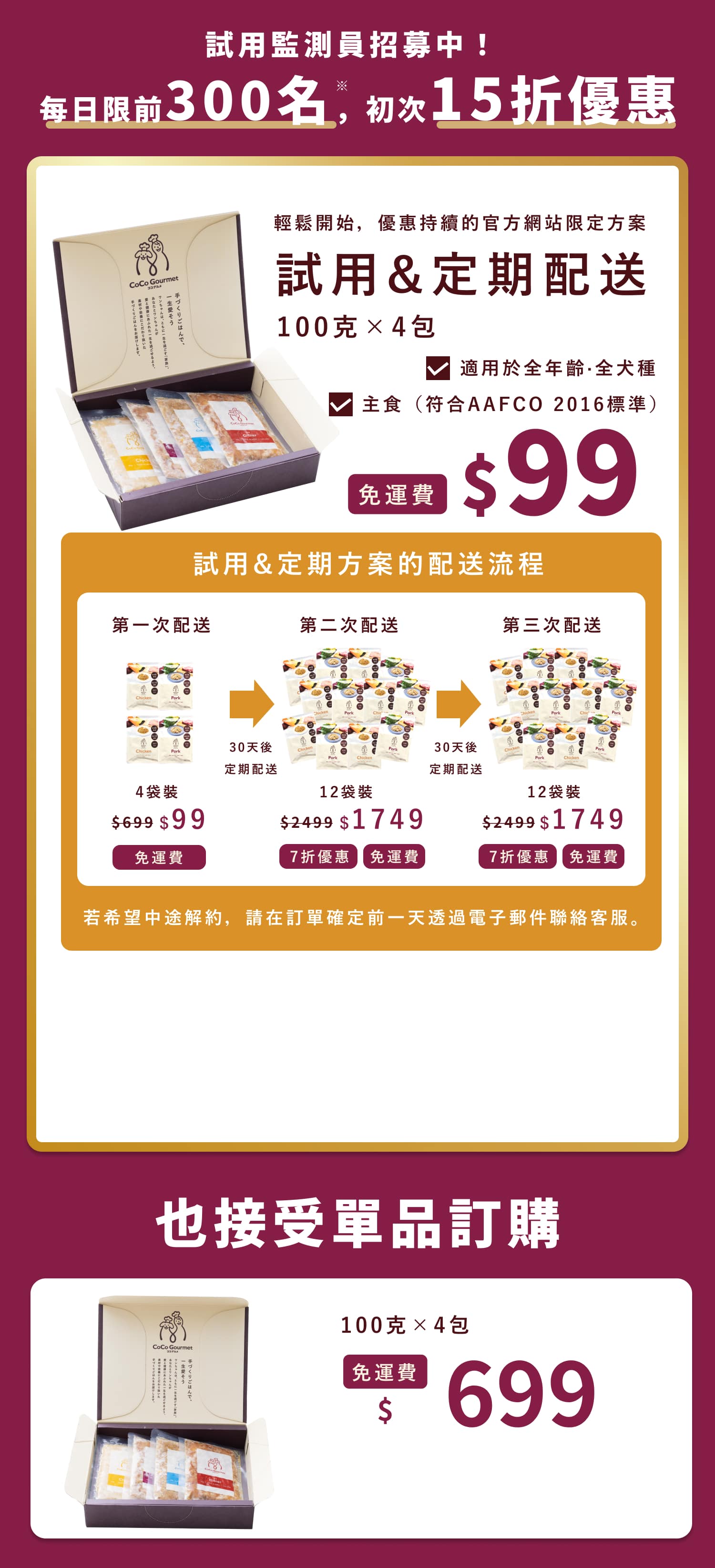 訂單開始 購入方法 最推薦 試用&定期配送 15折 12袋 $99 全額退款保証 隨時可以解約 第2次之後也毎次7折(12袋$1749) 商品需要 最推薦 可以享受4種口味 4種套裝雞肉・豬肉・魚肉・鹿肉 總計 - × 1 1 箱 $ 配送希望日 12月10日 12月11日 12月12日 12月13日 12月14日 12月15日 12月16日 12月17日 12月18日 12月19日 由於農曆春節期間(1/25〜2/3)為配送公司的休業日,因此無法將此期間指定為送貨日期。造成不便,敬請見諒,感謝您的理解。 購入頻度 訂購資訊 姓名 需要 收件地址 需要 郵遞區號 縣市 -- 選擇 -- 臺北市 基隆市 新北市 宜蘭縣 新竹市 新竹縣 桃園市 苗栗縣 臺中市 彰化縣 南投縣 嘉義市 嘉義縣 雲林縣 臺南市 高雄市 澎湖縣 屏東縣 臺東縣 花蓮縣 金門縣 連江縣 區域 -- 選擇 -- 詳細地址 手機號碼 需要 電子郵件 需要 付款方式 請選擇付款方式 需要 ※選擇信用卡付款的客人請注意※ (1)本產品是由日本直接寄送,視同海外交易。故當您選擇信用卡付款時,會因為每間信用卡公司的規定不同,以及您與信用卡公司的合約內容不同,產生額外費用。由於上述原因,您的信用卡對帳單中扣除的商品價格,會與本頁面的表示價格有落差(受日幣匯率浮動影響)。另外,您也可能需要支付國外交易手續費,此費用是由信用卡公司收取,本公司恕不負擔。(2)退款時,依當下匯率進行退款。因退款所產生的任何手續費,本公司恕不負擔,敬請見諒。(3)若您對匯率與國外交易手續費有任何疑問,請聯絡您的信用卡發卡公司查詢,本客服中心無法代查,敬請見諒。 信用卡卡號 需要 請用半角數字輸入 安全碼 需要 信用卡品牌僅限VISA、MasterCard、JCB可供使用。 安全碼是卡片背面簽名欄末三位數字。(請參考下圖) 信用卡有效日期 需要 請選擇010203040506070809101112 / 請選擇202520262027202820292030203120322033203420352036203720382039204020412042204320442045 ※請注意,通常有效日期為月/年的順序表示 送貨方式 送貨方式需要 選擇國家後,系統會為您自動選擇發貨方式。 配達日遇國定假日則順延 7-11超商取貨必選 請選擇門市※僅提供取貨(無超商付款) ☓ 取消選擇 超商ID/名 / 超商地址 取件服務時間 日 一 二 三 四 五 六 完 成 購 買